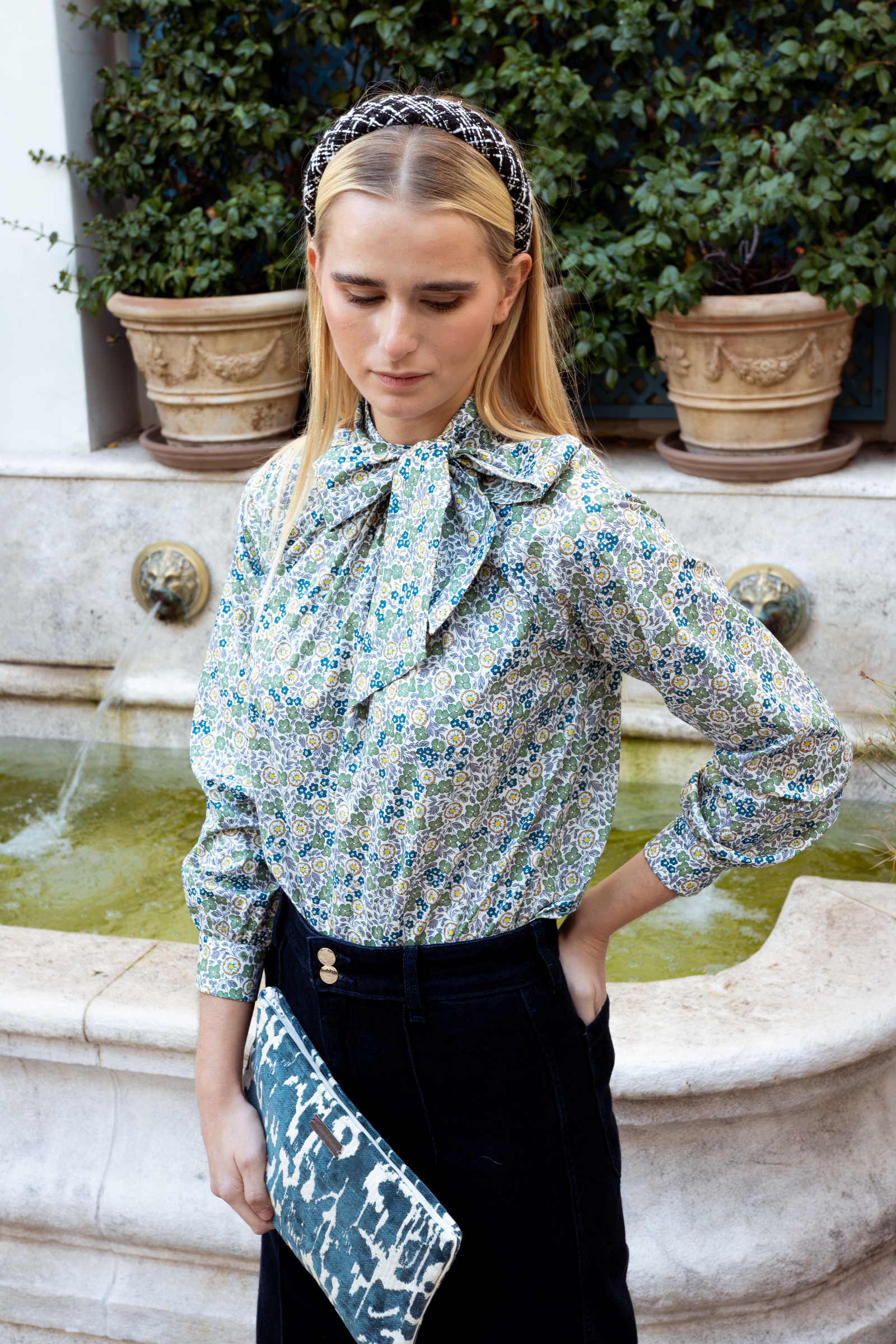 Dorset es una blusa con lazada, pero con un aire más fresco y casual, que me encanta sobre vaqueros. Con un cuello ligeramente elevado y pequeñas pinzas que lo rodean, remata en una lazada que podrás colocar en el frente o bien a la espalda. Su estampación floral recuerda a los modelos de camisería británicos, con un colorido en el que dominan los tonos verdes, grises y mostazas.