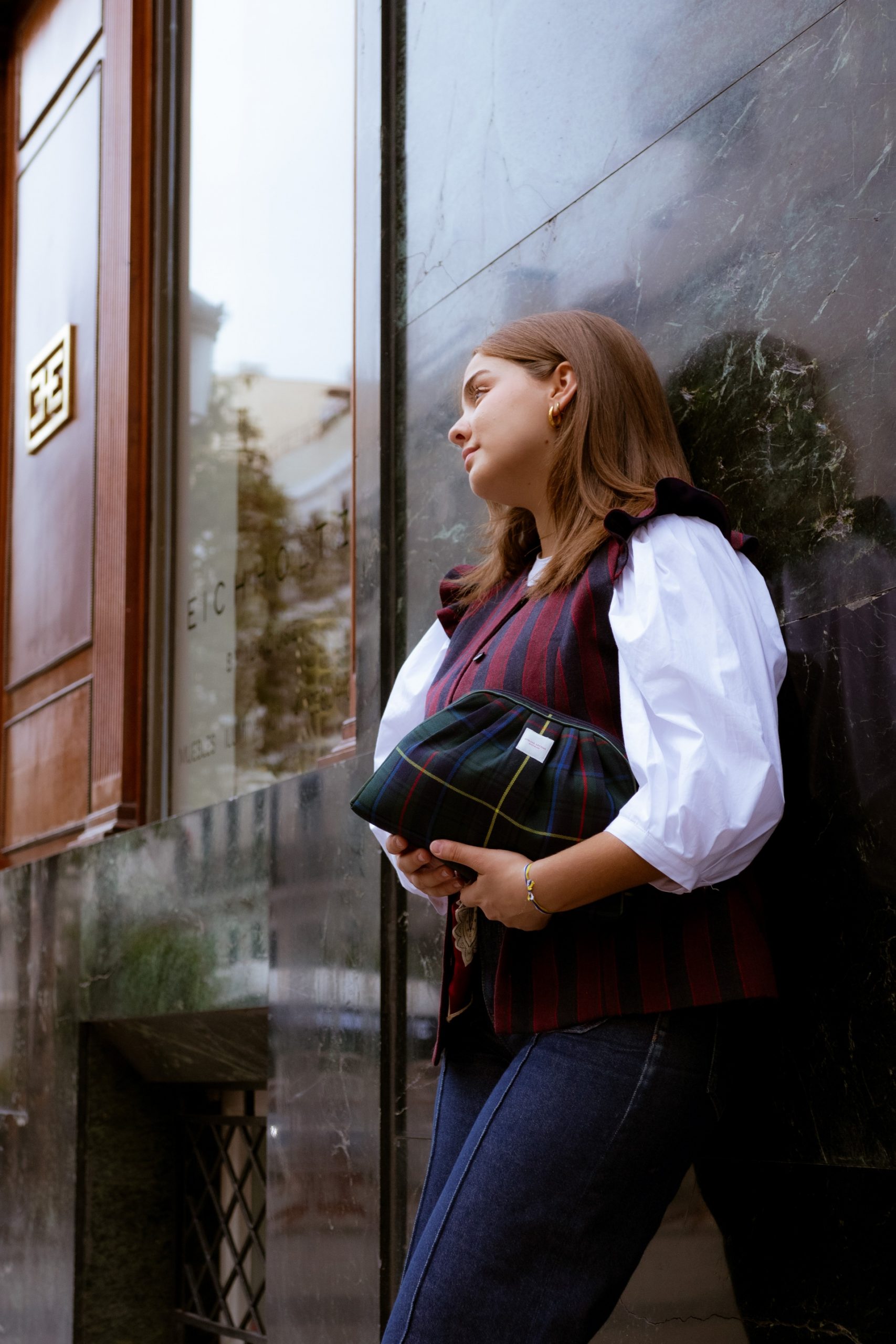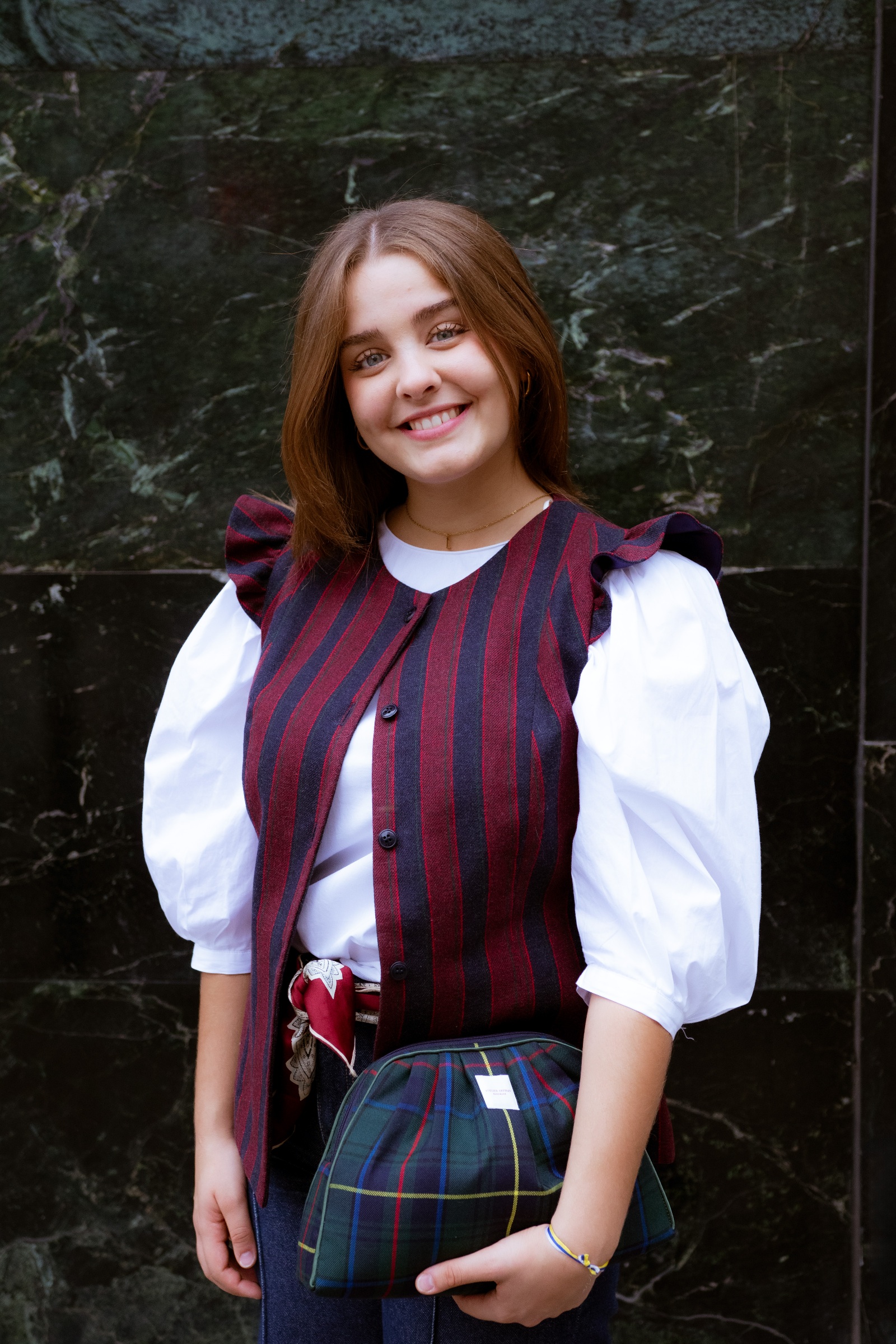 Kent es un chaleco de estillo college que sienta fenomenal, por sus costuras tanto en su frontal como en la espalda, que hacen que se ciña sutilmente a las líneas del cuerpo. El detalle de sus hombros con unos pequeños volantes, dan ese toque «naïf» y delicado a la prenda, cerrando con cuello a la caja y con botones. Kent queda aproximadamente por encima de la cadera, y está forrado por un satén en azul marino.