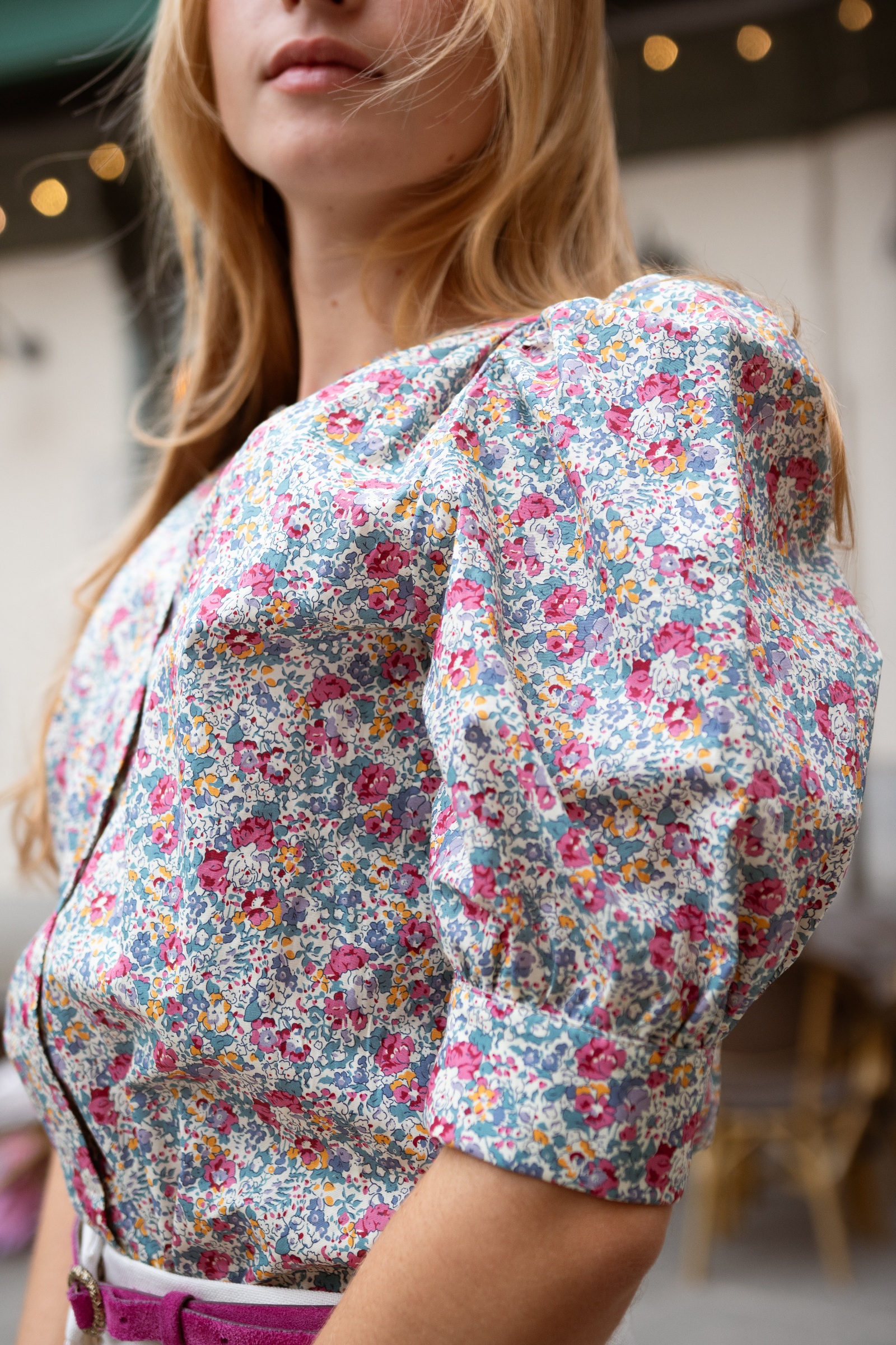 Liz, con sus pequeñas flores en azules y magentas, nos recuerda a los modelos de blusas clásicos de nuestra infancia. Con cuello a la caja y botonadura en su frontal, tiene un pequeño canesú con pinzas rematado por un vivo en color magenta, que continúa a la espalda. El detalle de sus mangas, francesas y ligeramente abullonadas, completan una blusa llena de detalles cuidados.