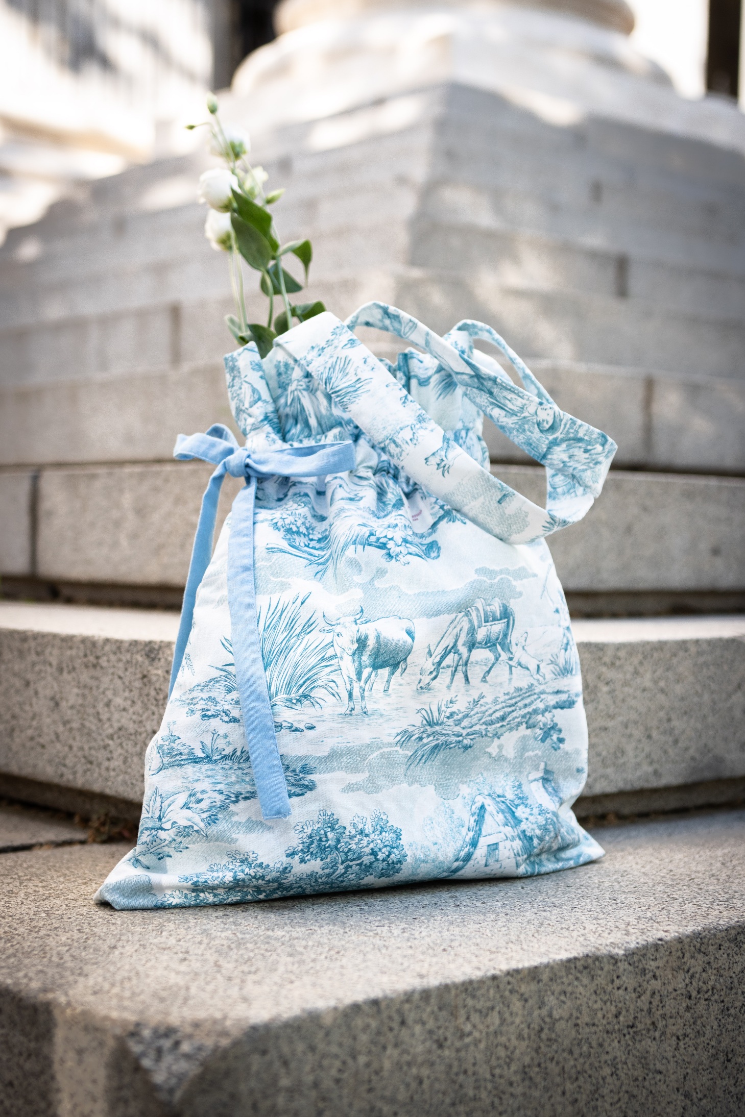 Nuestra nueva versión del bolso de toile de jouy, pensado para llevar al hombro. En base crema muy suave y con los dibujos en color rosa. Tiene buena capacidad y cierra tirando de sus cintas de algodón en lazada, frunciendo el bolso y creando unos ligeros volantes. Su interior va forrado con loneta de algodón rosa y dispone de un pequeño bolsillo.